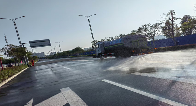 慢車道沖洗在比賽中考驗駕駛員和沖水工的合作默契程度,沖水工每個邊邊腳腳都認真沖洗,駕駛員幫忙擦洗護欄,護欄每條欄桿都洗一遍,擦洗一塵不染。兩個人默契合作顯示團隊精神。